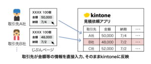佐藤様:購入依頼はmanageのワークフローでの申請になりました。申請されると、kintoneで構築した購買管理のアプリにデータが連携されます。商品によって見積依頼をする取引先が異なりますが、取引先はマスタ化されていて複数の取引先に一斉に見積依頼をすることができます。取引先の担当者は、kintoneの連携サービス「じぶんページ」に見積依頼が届くので、確認して金額を登録します。
